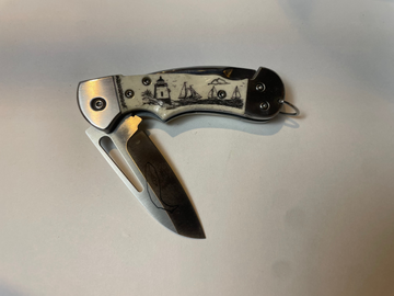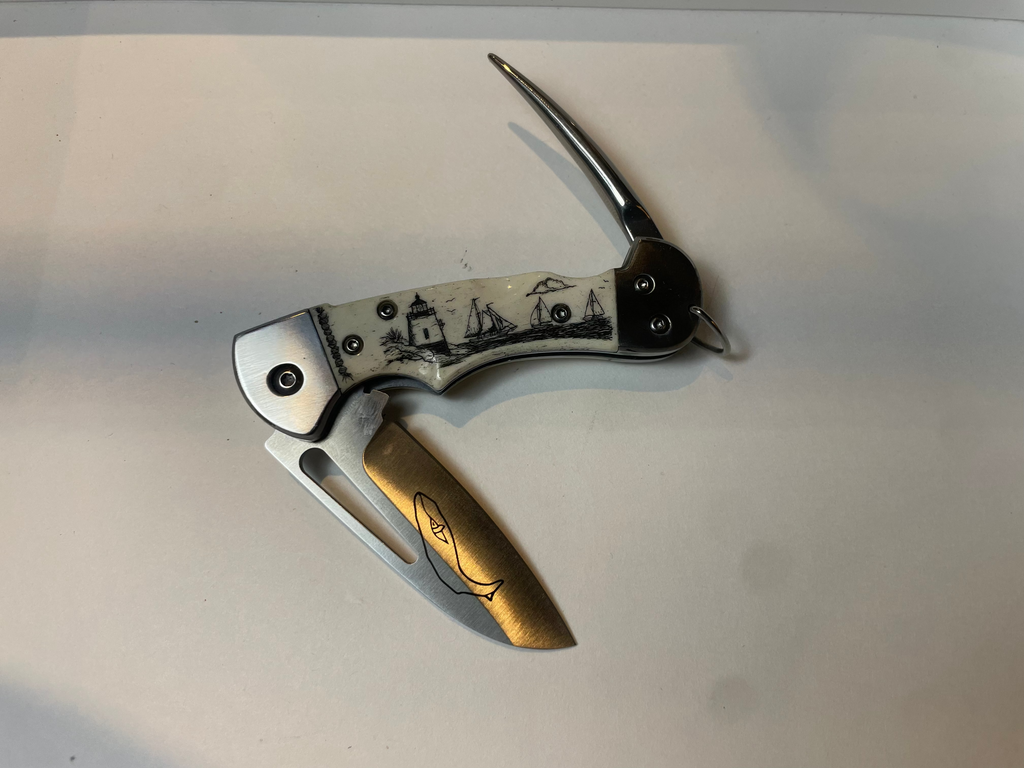 Myerchin Rigging Knife with authentic Scrimshaw by resident artist Brian Kiracofe.