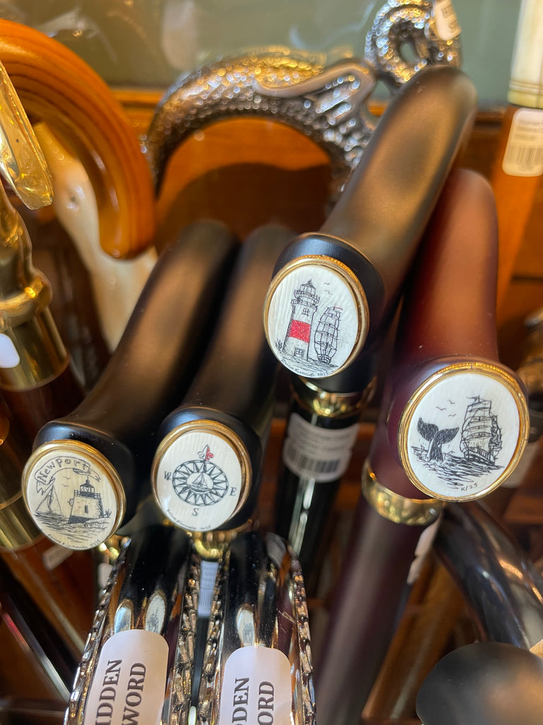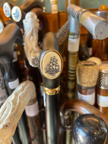 Vista International Corp made canes featuring a bezeled scrimshaw piece on the handles! Original scrimshaw designs hand engraved on fossilized wooly mammoth ivory by resident artist Brian Kiracofe. Designs are subject to availability due to hand engraved nature of the product.